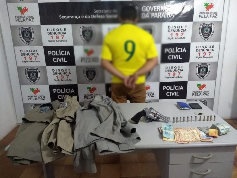 A prisão aconteceu na tarde da última segunda-feira (11), onde em posse do suspeito havia: um revólver calibre 357; munições de calibre 357; munições calibre 38 intactas; 04 gandolas da Polícia Militar; aves silvestres e R$ 19.916,00, em espécie.