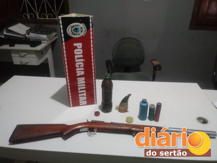 De imediato uma guarnição se deslocou ao local, onde visualizou um homem no meio da estrada portando uma espingarda artesanal de calibre indefinido e uma bolsa com seis recipientes, os quais continham espoleta, pólvora e várias esferas metálicas.