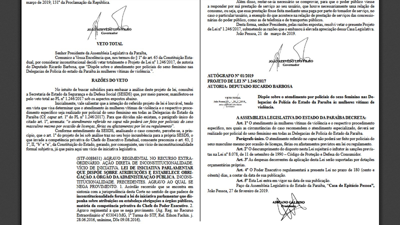 Fonte: G1 PB - https://g1.globo.com/pb/paraiba/noticia/2019/03/22/vetado-projeto-na-pb-que-obrigava-mulher-agredida-a-ser-atendida-por-policial-do-sexo-feminino.ghtml