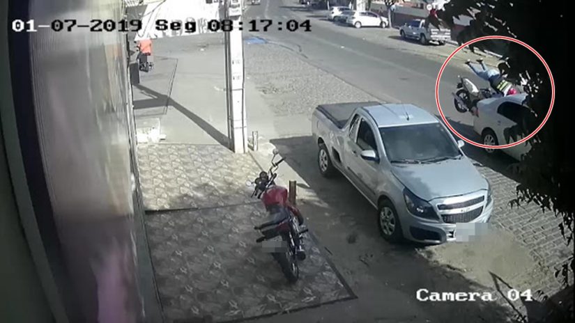 O fato foi registrado na Rua Romualdo Rolim e foi flagrado pelas câmeras de segurança, onde mostram um carro de cor branca saindo de uma garagem quando o motoqueiro colide na traseira do veículo.
