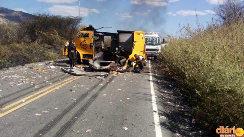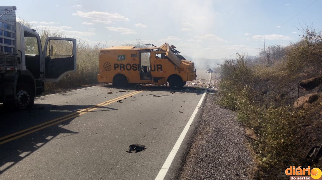 Grupo fortemente armado explode carro-forte em rodovia do Sertão do estado; veículo ficou destruído