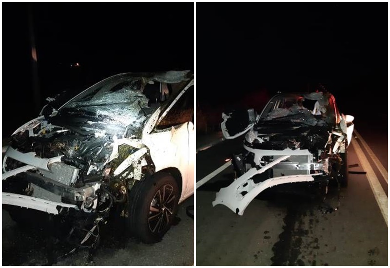 Sem ter como desviar, o veículo acabou acertando em cheio o animal. Imagens impressionantes mostram como o veículo ficou após a colisão.