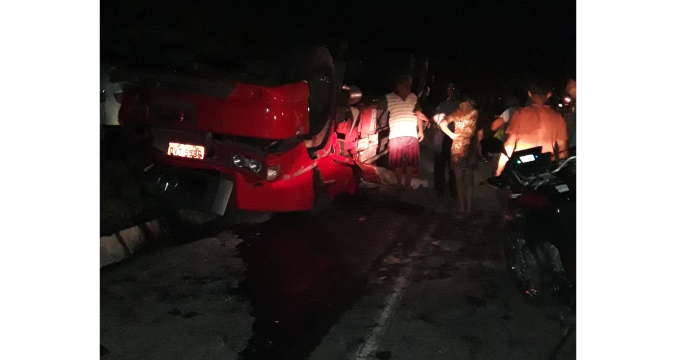 O veículo capotou até ficar com as rodas para cima. O motorista e o ajudante ficaram presos nas ferragens e levado ao hospital.