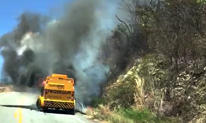 Os funcionários da empresa de transporte de valores eve que sair as pressas do veículo e aguardar ajuda. Apensar do susto, ninguém se feriu.