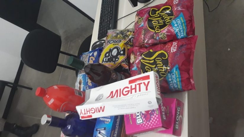 Diante das características repassadas, foram feitas rondas sendo um dos suspeitos encontrado, e com ele duas sacolas com bebidas, cigarros, chocolates, doces, salgadinhos, entre outros.