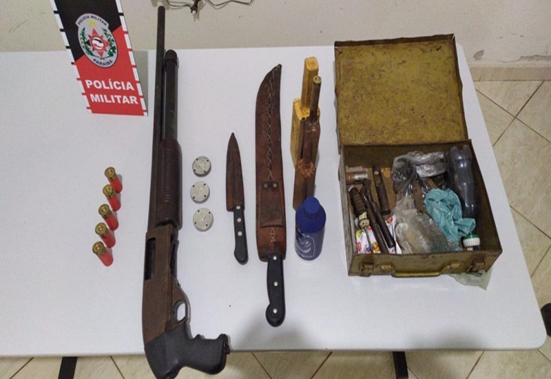Os militares passaram a realizar diligências, localizaram o suspeito e após uma revista, foi encontrado no interior do automóvel uma espingarda calibre 12 com cinco munições intactas, armas brancas e material para recarga de cartucho.