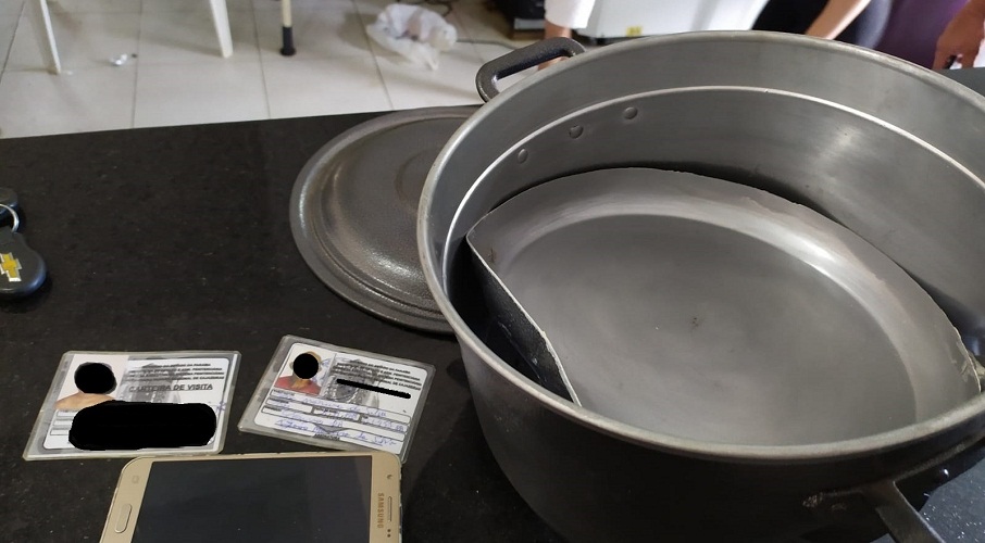 Neste sábado (30), um idoso de 81 anos e uma adolescente foram flagrados tentando entrar com um celular escondido no fundo falso de uma panela.