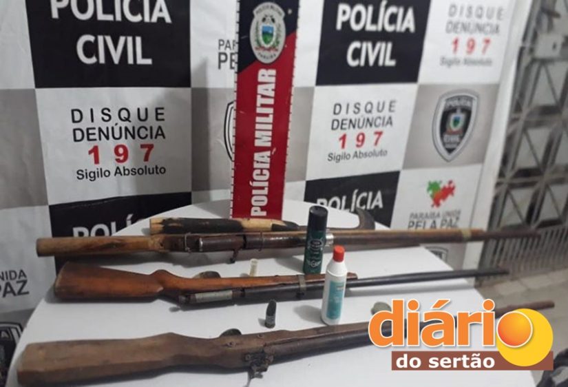 Além das armas de fogo, insumos para recarga e uma foice foram apreendidas