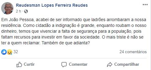 “Acabei de ser informado que ladrões arrombaram a nossa residência. Como cidadão a indignação é grande, enquanto roubam o nosso dinheiro, temos que vivenciar a falta de segurança para a população, pois faltam recursos para investir em favor da sociedade”, comunicou o cajazeirense que está de férias na capital do Estado.