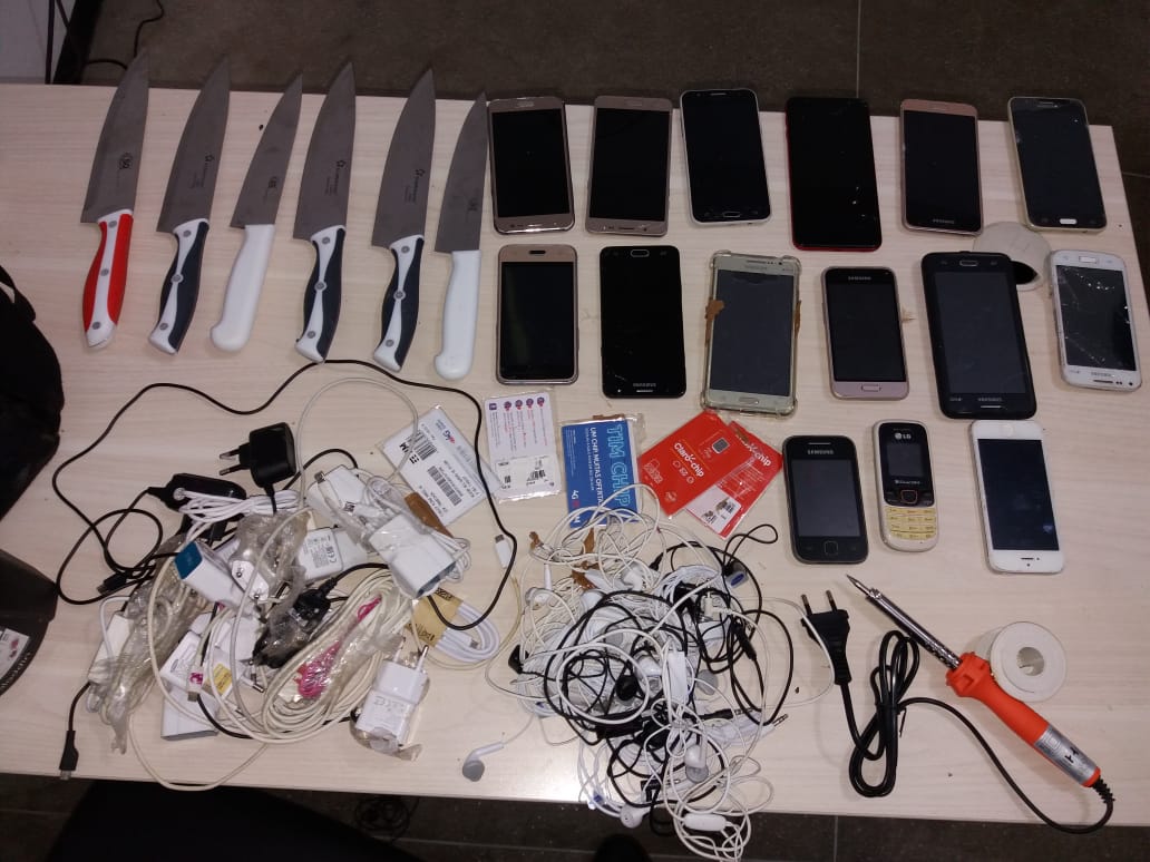O suspeito foi preso ao ser localizado em um matagal por policiais penais que faziam ronda pelo presídio. Na bolsa havia 15 celulares, 05 chips, 06 facas, 15 carregadores de celular, 18 fones de ouvido, 01 máquina de solda e 01 recipiente para líquido.