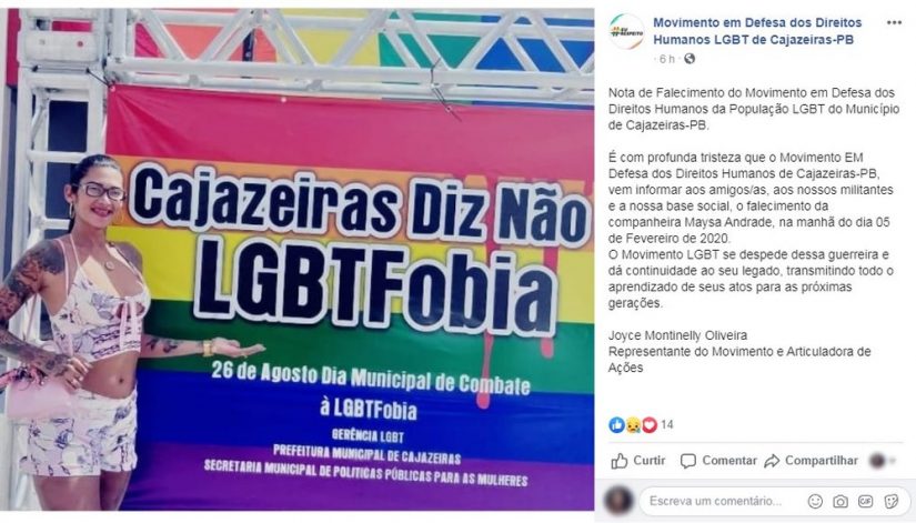 Em nota, o Movimento em Defesa dos Direitos Humanos LGBT de Cajazeiras, lamentou a morte de Maísa: