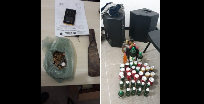A bolsa continha bebidas, dinheiro, uma máquina de cartão de crédito e uma ferramenta possivelmente usada para a prática do delito. Os suspeitos foram levados à delegacia para as medidas cabíveis.