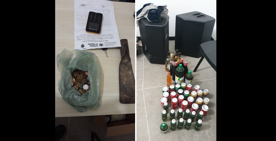 Com os suspeitos a polícia encontrou caixas de com, bebidas, dinheiro, máquina de cartão e ferramenta