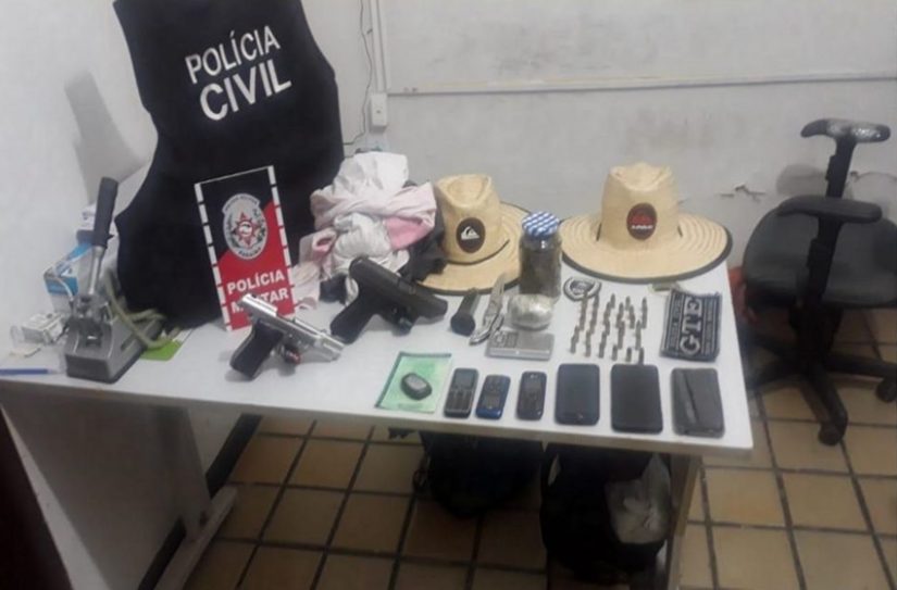 Com os suspeitos foram encontrados uma pistola calibre 380 e outra calibre 9mm, 38 munições intactas dos dois calibres, grampos e aproximadamente 400 gramas de uma substância análoga à maconha.