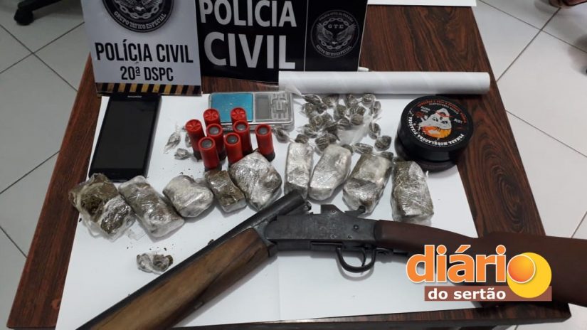 Através de cumprimento a um mandado de busca e apreensão expedido pela Comarca de São José Piranhas, em desfavor de um menor de 17 anos, foram apreendidas uma espingarda, calibre 12, munições do mesmo calibre, além de quase um 1kg de maconha e diversos invólucros plásticos próprios para comercialização do entorpecente.