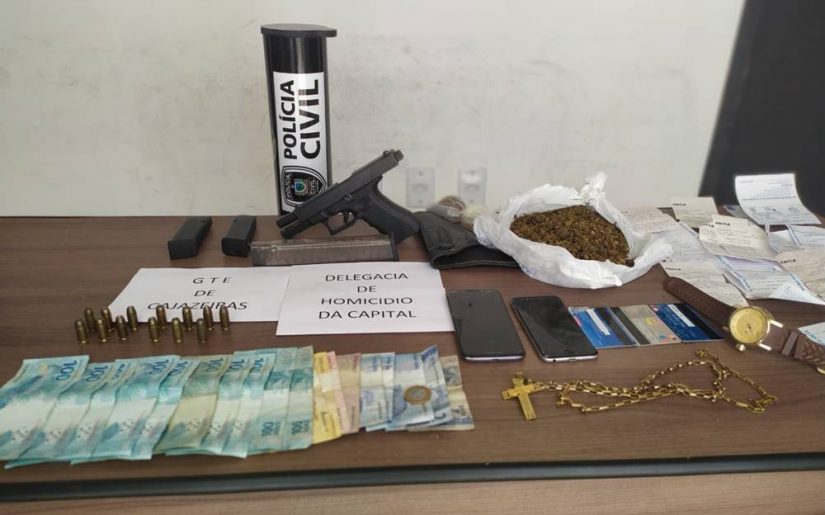 Os agentes apreenderam na ação uma pistola .40, um carregador estendido, munições e 500 gramas de uma substância semelhante à maconha