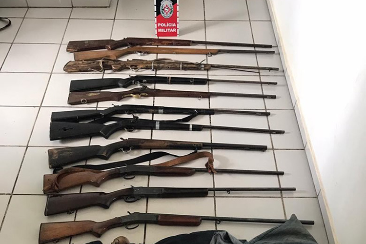 As 11 espingardas apreendidas, o homem, o adolescente e o pai dele foram encaminhados para a Delegacia da Polícia Civil na cidade de Água Branca.