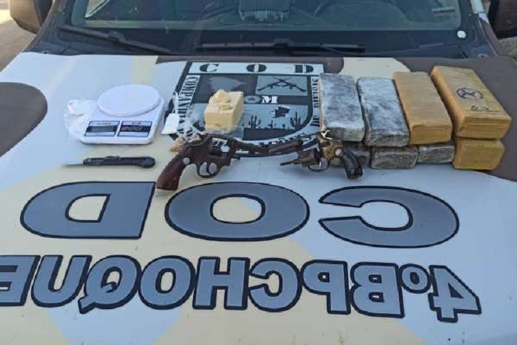 Foram apreendidos com o suspeito, dois revólveres, um calibre 38 com seis munições intactas e outro, calibre 32 com quatro munições intactas. Além das armas, foram apreendidos diversos tipos de drogas e outros equipamentos: quase seis quilos de maconha, 23 gramas de crack, 26 gramas de cocaína, 414 gramas de pasta base, uma Balança de precisão, um aparelho celular, um tablet e 50 sacos de picolé para embalar drogas.