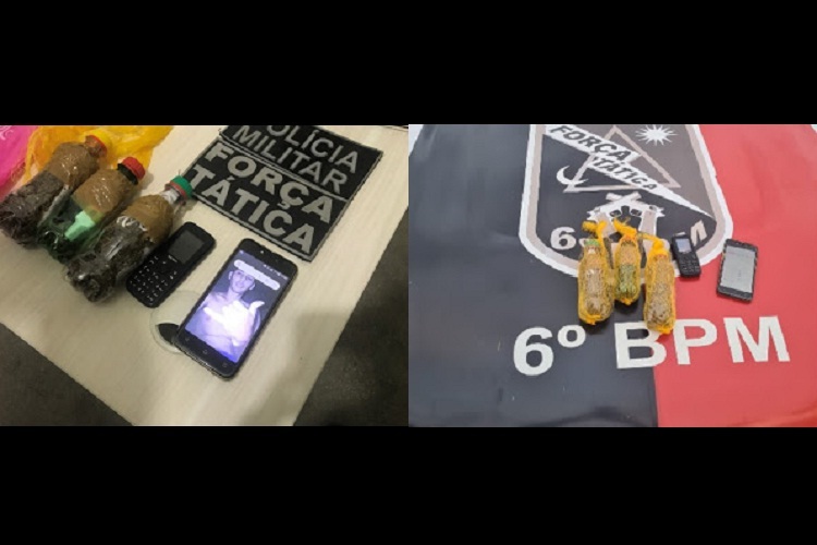 Segundo informações da polícia, com eles foram encontrados uma sacola contendo quatro celulares, dois carregadores, um chip de operadora de telefonia móvel e 100 gramas de uma substâncias semelhante à maconha.