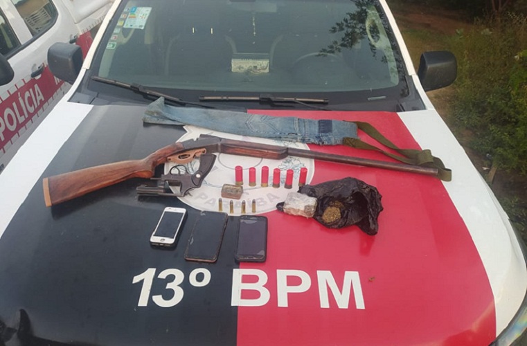 Com o meliante, os policiais do 13º Batalhão apreenderam uma escopeta calibre 12, um revólver calibre 38, várias munições e embalagens com maconha.