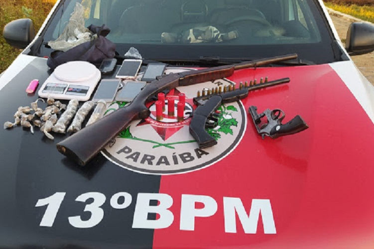 Os suspeitos são todos naturais de Patos e têm as idades de 35, 23 e 27 anos respectivamente. Com eles foram apreendidos uma escopeta cal. 12 mm, um revólver cal. 38 mm e uma arma de fabricação caseira calibre 28 mm, além de várias munições calibres 12 e 38. Substâncias semelhantes à maconha e crack e uma balança de precisão também estavam em poder dos meliantes.
