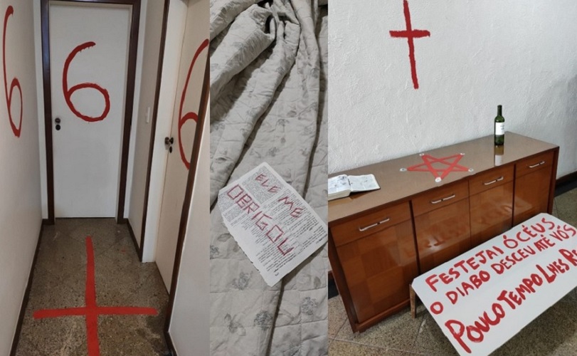 Entre os escritos havia símbolos religiosos e alguns voltados ao Apocalipse como o “666” escrito em portas, cruzes invertidas, além de frases pintadas pelas paredes e portas.