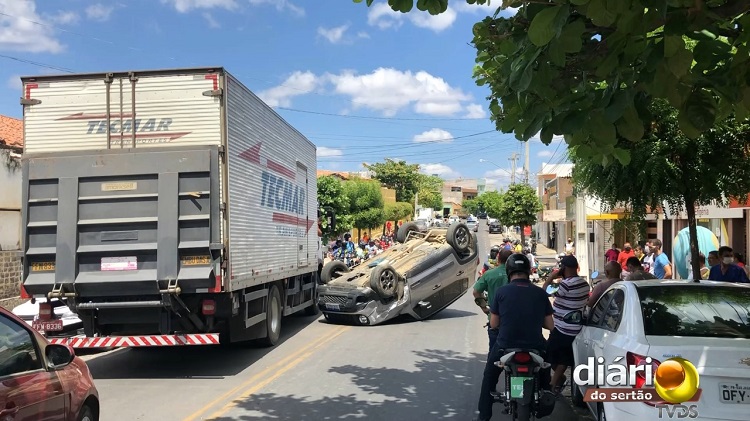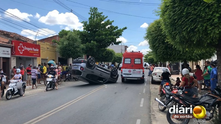 VÍDEO EXCLUSIVO: Carro tomba no centro de Cajazeiras após colisão e motorista incrivelmente sai ilesa