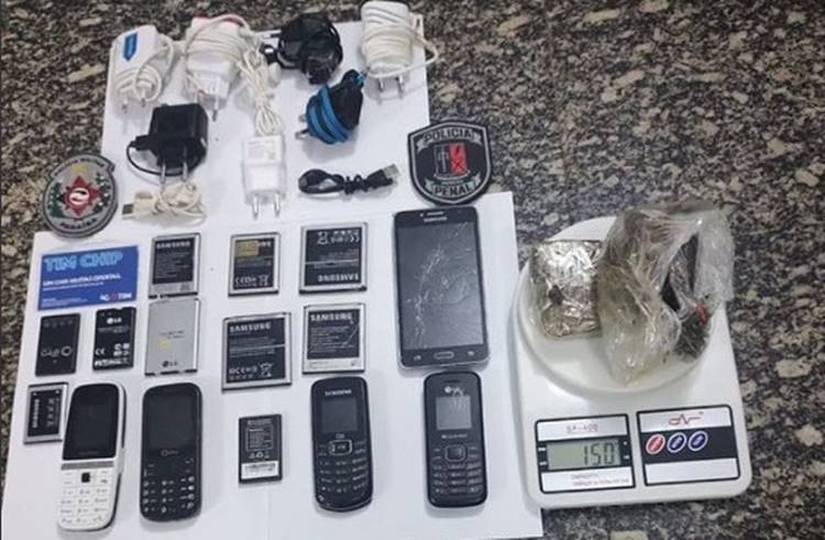 Durante a ação, os policiais encontraram um pacote, contendo três tabletes de maconha (151g), cinco aparelhos celulares, dez baterias, um chip, sete carregadores e um fone de ouvido.