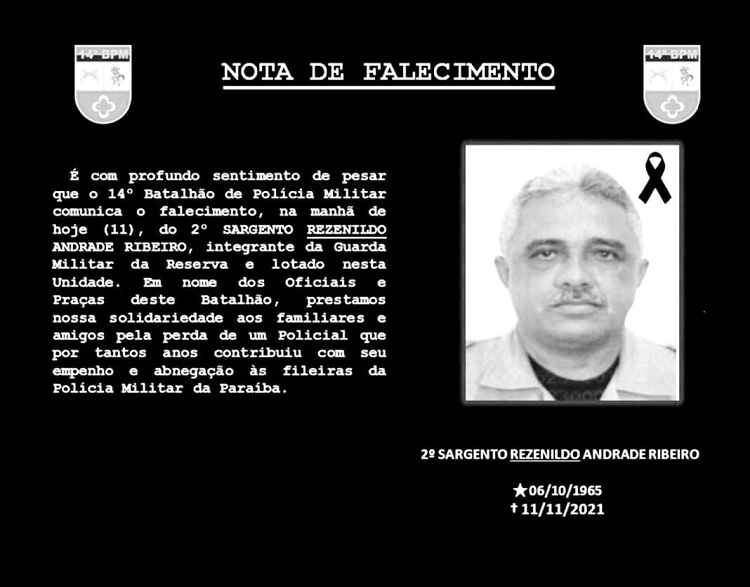 A assessoria de comunicação do 14º BPM emitiu uma nota de pesar pelo falecimento do sargento Rezenildo Andrade Ribeiro em nome dos Oficiais e Praças da Unidade; confira:
