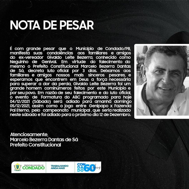 A prefeitura da cidade de Condado emitiu uma nota de pesar em suas redes sociais e comunicou o adiamento de eventos que estavam marcados para serem realizados neste sábado (04). Confira: