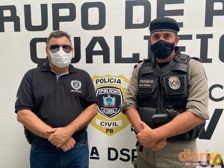 Delegado seccional de Cajazeiras e o tenente coronal Terceiro, comandante do 6º BPM. (Foto: TV Diário do Sertão).