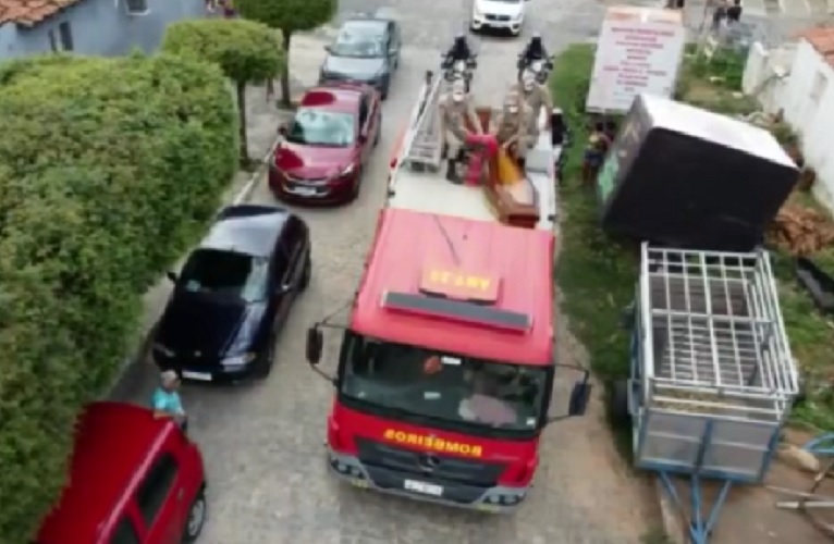 O féretro foi conduzido pelas ruas da cidade no caminhão do Corpo de Bombeiros. (Foto: print de tela).