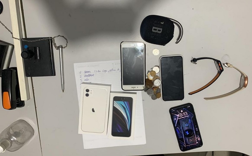 A denúncia foi de que dois homens armados teriam assaltado uma loja e subtraído aparelhos telefônicos e relógios. Após diligências da PM, parte dos objetos foram recuperados e quatro suspeitos conduzidos à DP