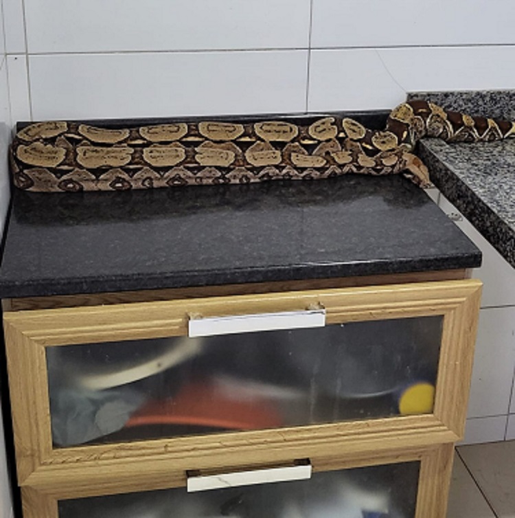 A família ficou assustada ao se deparar com a jiboia em cima de uma balcão próximo à pia da cozinha. (Foto: divulgação).