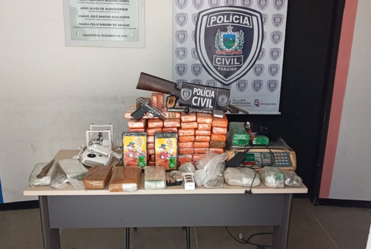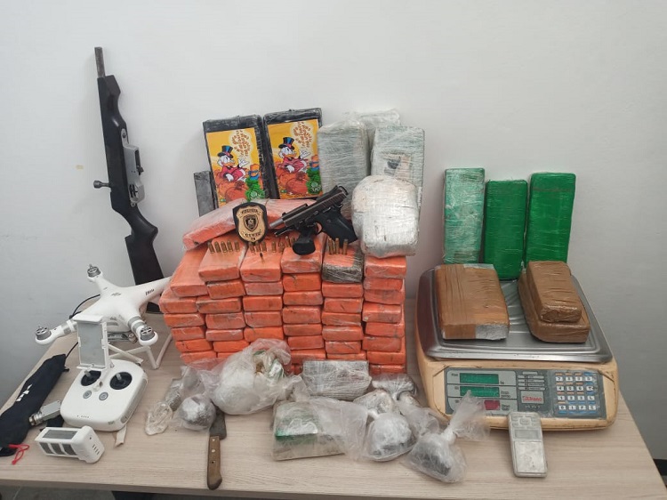 Além dos entorpecentes, a polícia informou que foram apreendidos uma Pistola, uma espingarda Calibre 12, um drone avaliado em R$ 7 mil e uma balança de precisão