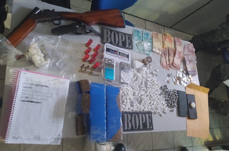 Com o grupo criminoso foram apreendidas armas de fogo, sendo uma espingarda 12, um revólver, além de farta quantidade de materiais semelhantes a entorpecentes.