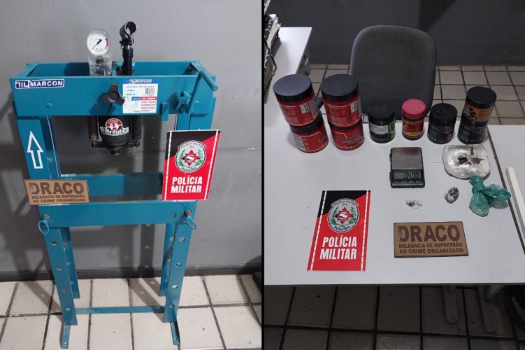 Durante a ação policial foram apreendidas maconha, cocaína, balança de precisão, prensa hidráulica e outros materiais usados no refino de drogas.