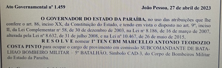 O governador João Azevêdo nomeou ao cargo de subcomandante do 5º Batalhão de Bombeiro Militar, sediado em Cajazeiras, o 1º tenente Marcello Antonio Teodozio Costa Pinto. O ato foi publicado no Diário Oficial do Estado da Paraíba (DOE-PB) na edição desta sexta-feira (28).