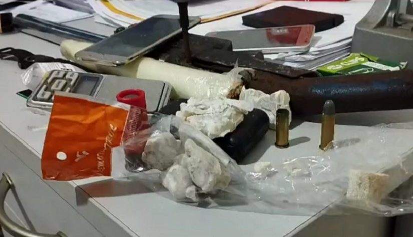 No decorrer das diligências, os policiais apreenderam uma espingarda calibre 12 e munições, além de porções de cocaína, balança de precisão e material plástico utilizado para embalagem de drogas.