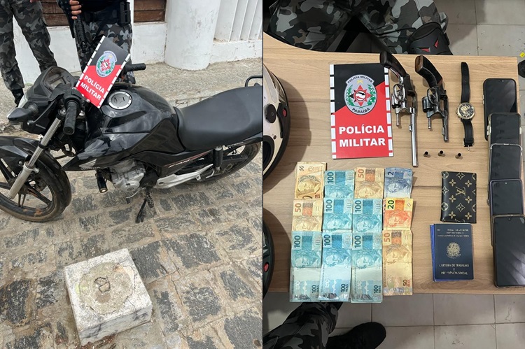 A PM relatou que a dupla estava armada e em uma moto roubada. Os criminosos subtraíram em torno de R$ 12 mil, além de celulares, joias e outros pertences das vítimas, mas tudo foi recuperado pelos policiais, inclusive as armas