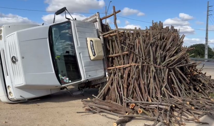 VÍDEO: Caminhão carregado de lenha tomba na BR 230 em Pombal e motorista sai ileso