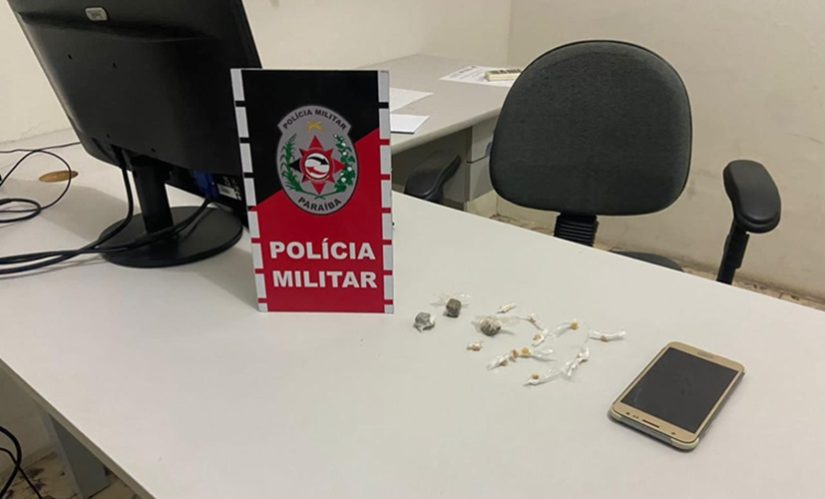 Com ele, a polícia encontrou um aparelho celular, 12 pedras de substâncias análogas ao crack e três papelotes de substâncias similares à maconha – Foto: divulgação/PMPB