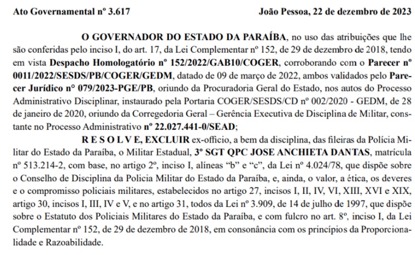 O sargento reformado da Polícia Militar da Paraíba, José Anchieta Dantas, que há exatamente 5 anos, no dia 23 de dezembro de 2018, matou com um tiro o técnico de internet Antônio Ramalho Martins, conhecido como Hominha, na cidade de Cajazeiras, foi expulso da corporação conforme ato governamental publicado no Diário Oficial do Estado da Paraíba (DOE-PB) deste sábado (23).