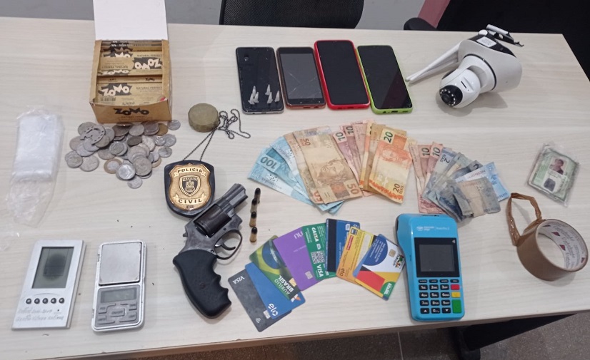 No local foram apreendidos um revolver calibre 38 com munições, uma quantidade não informada de cocaína, balanças de precisão, dinheiro, uma maquineta de cartão de crédito e vários cartões do programa Bolsa Família.