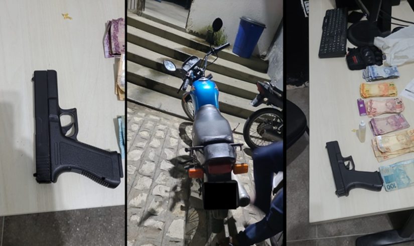 Com o suspeito, os policiais encontraram duas quantias em dinheiro roubadas da lanchonete e do posto de combustível, além de uma moto furtada. A arma também foi apreendida e se tratava de um simulacro.