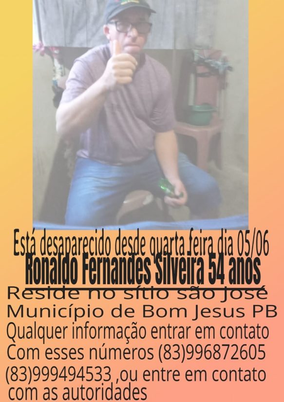 Um primo do desaparecido registrou um BO no último sábado (08) na delegacia de Cajazeiras. Caso alguém saiba do paradeiro de Ronaldo Fernandes Silveira, deve entrar em contato com urgência pelos números (83) 99949-4533 ou (83) 99687-2605