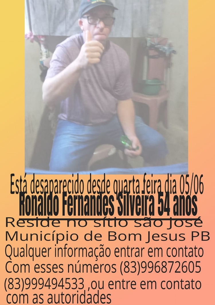 Caso alguém saiba do paradeiro de Ronaldo Fernandes Silveira, deve entrar em contato com urgência pelos números (83) 99949-4533 ou (83) 99687-2605.