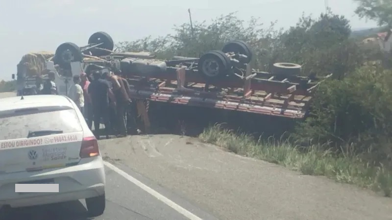 Um caminhão carregado com maracujá capotou na tarde desta quarta-feira (31) por volta das 14h30 na BR 230, Km 235,3, sentido crescente da via, no município de Juazeirinho, região do Seridó paraibano.