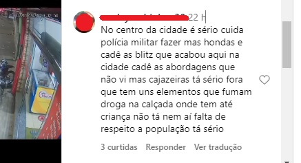 Outro internauta faz um apelo para que a Polícia Militar intensifique abordagens no Centro comercial. “Cajazeiras tá sério. Fora que tem uns elementos que fumam droga na calçada onde tem até criança. Não tá nem aí. Falta de respeito à população”, desabafou.