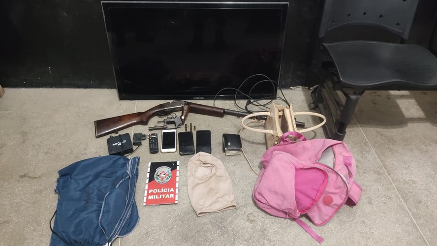 Após a abordagem no referido veículo, foram encontradas duas armas de fogo, sendo uma espingarda calibre 12 e um revólver calibre .38 municiado com cinco estojos deflagrados, um aparelho celular, uma balaclava e um enforca gato.